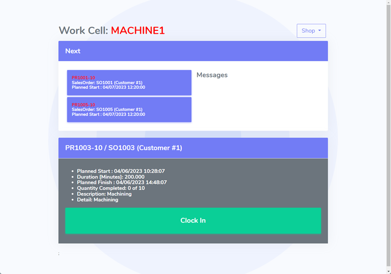 Velosity offers a shop floor interface that can be displayed at machines and workcenters on rugged tablets and touchscreens. From this interface, personnel can "clock in" to production order and mark completion progress (units completed).