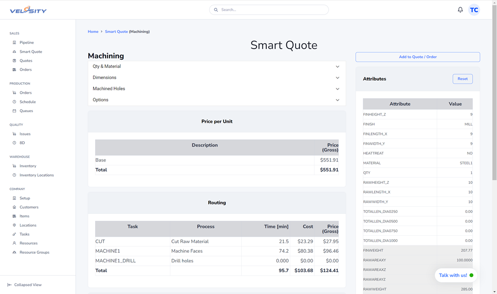 Velosity automates the Quoting + Scheduling process by automatically creating the router and Bill of Material via Smart Quote. A Sales person can determine a price for any complex build-to-order product or service and know an accurate delivery date at in less than 60 seconds (use of Velosity Scheduling Engine required)!