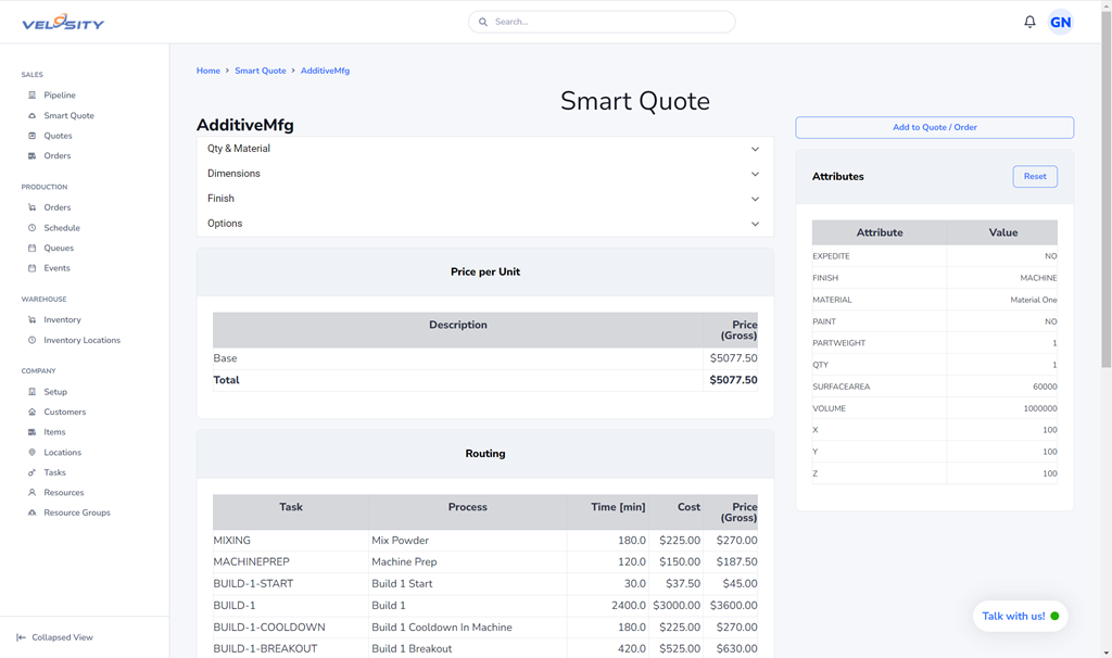 Velosity automates the Quoting + Scheduling process by automatically creating the router and Bill of Material via Smart Quote. A Sales person can determine a price for any complex build-to-order product or service and know an accurate delivery date at in less than 60 seconds (use of Velosity Scheduling Engine required)!