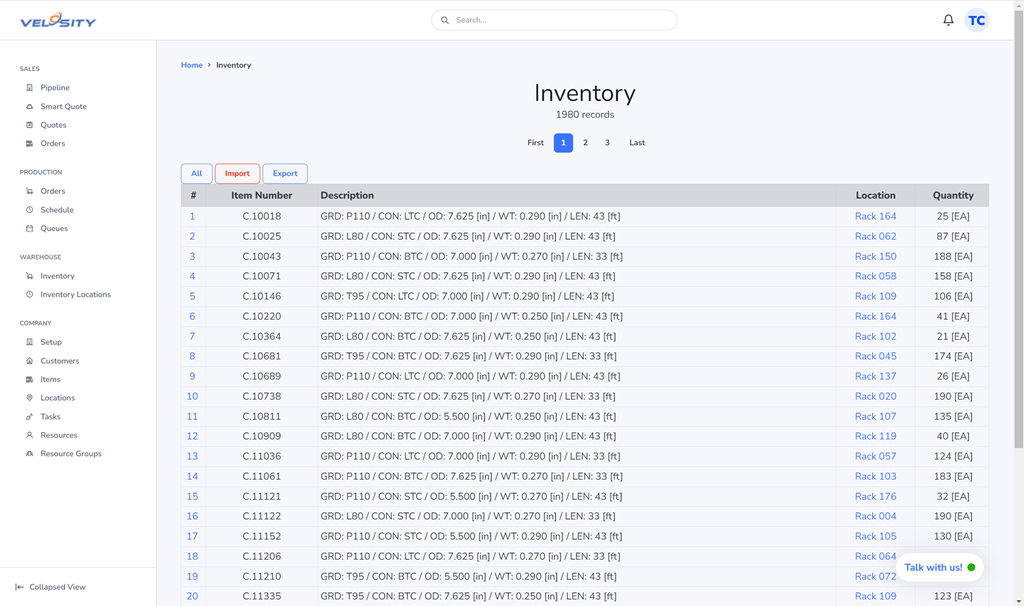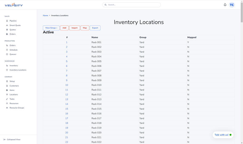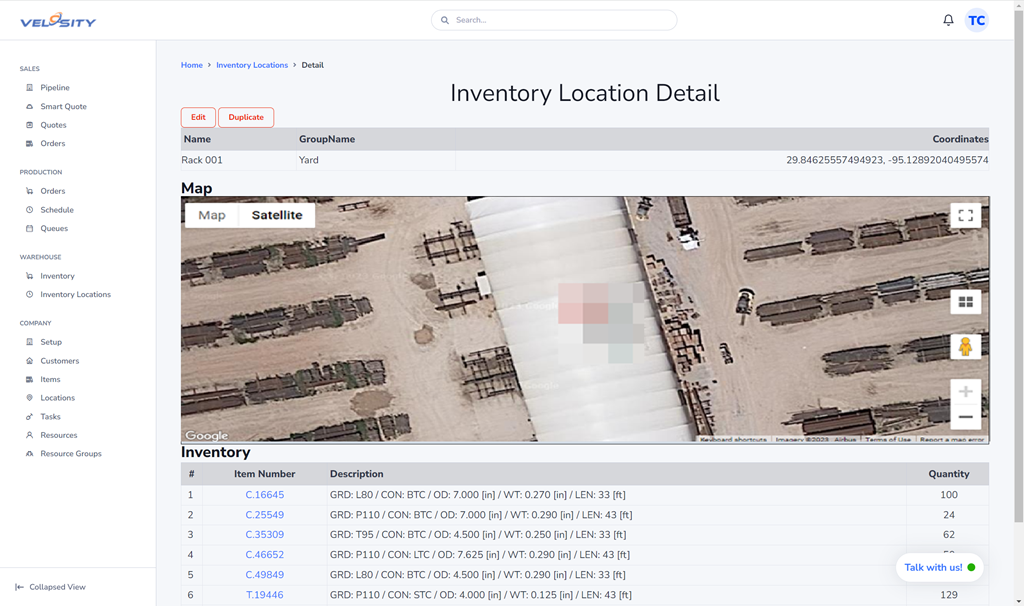 The location of inventory can also be managed within Velosity - supporting both indoor (warehouse) and outdoors. For outdoor locations, geo coordinates can be specified - Velosity shows on a map where the inventory is located. Locations can be imported into Velosity during the onboarding, and managed from Velosity after that.