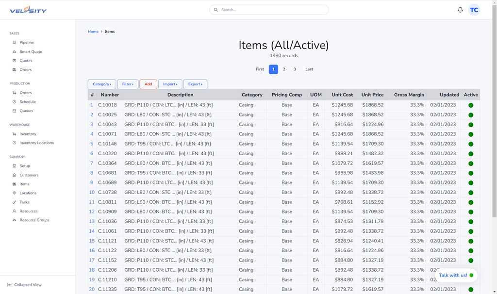 The Item Catalog is used Velosity in two ways. First, Smart Quote uses the Item Catalog is present to the user the options available for a particular Attribute. Secondly, Smart Quote uses the Item Catalog to to automatically create the Bill of Material. The Item Catalog should represent the complete set of what a Company wants to offer for a particular product. The Item catalog can be maintained within Velosity, or managed externally (Excel, ERP) and synchronized via import or ERP integration.