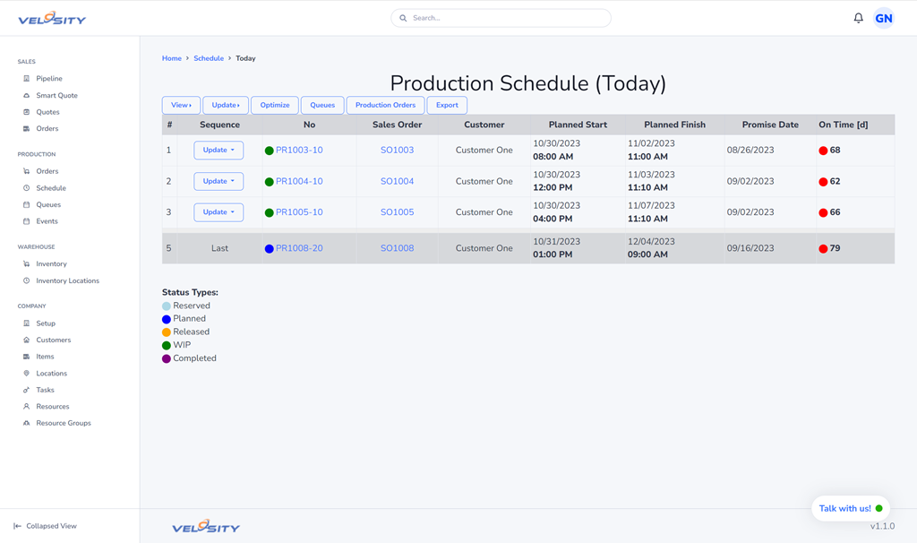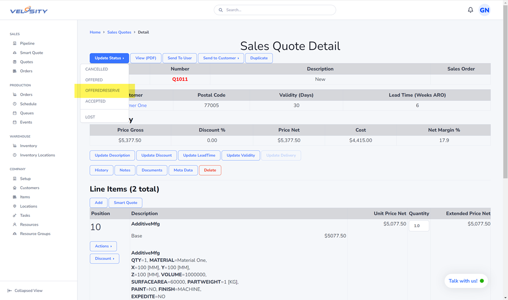 Velosity automates the Quoting + Scheduling process by automatically creating the router and Bill of Material via Smart Quote. A Sales person can determine a price for any complex build-to-order product or service and know an accurate delivery date at in less than 60 seconds (use of Velosity Scheduling Engine required)!