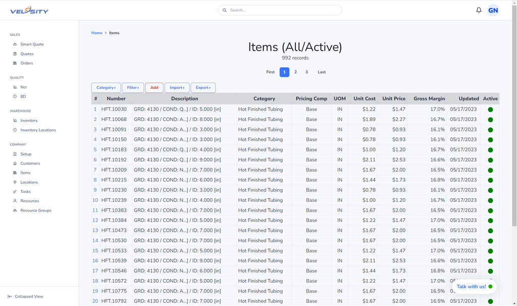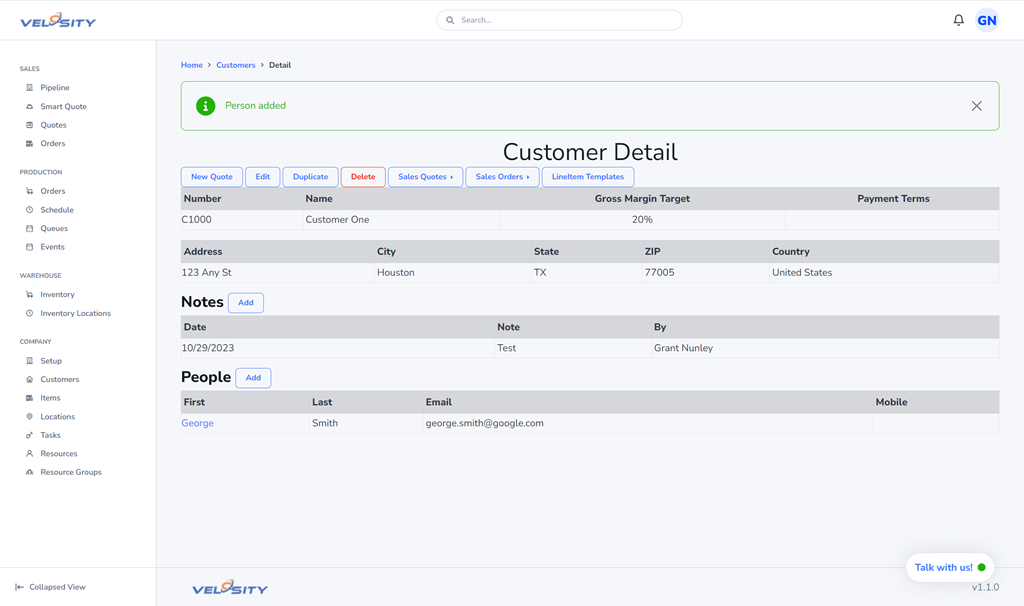 In the end, it's all about the customers. Velosity's Customers feature ensures that businesses can not only manage customer details but also quickly quote repeat orders with updated costs, fostering loyalty and repeat business. Complementing this is the General feature, which maintains an audit trail for various records and provides role-based view access control, ensuring transparency and building trust.