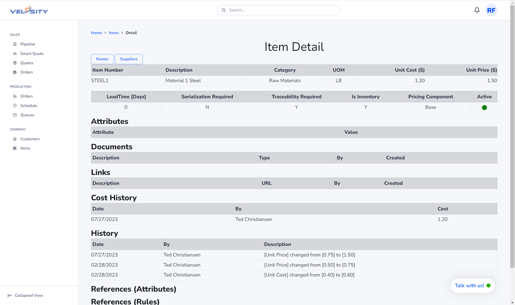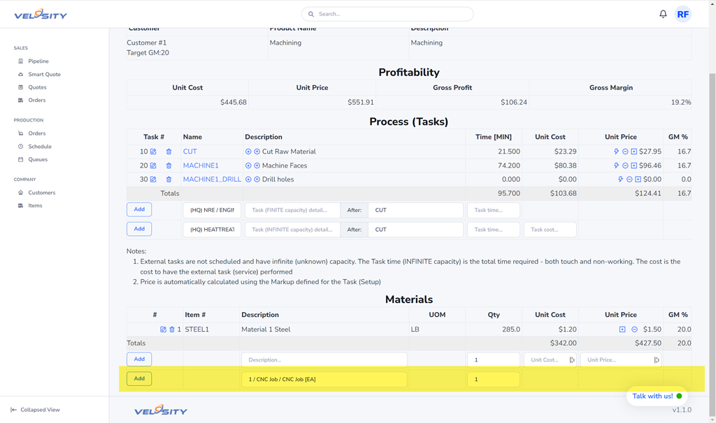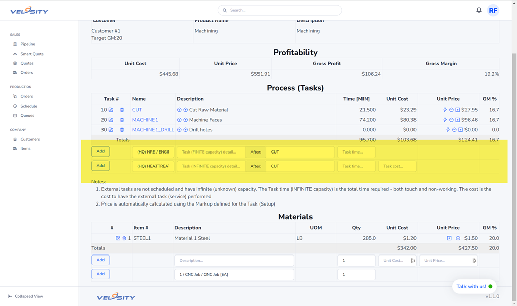 Because each order (line item) is unique, Velosity Smart Quote doesn't work. Instead the Velosity Line Item Editor is used to create the router and the BOM. The Tasks defined in the Company Setup are used to calculate the process cost. The BOM can use the Item Catalog (optional module) or the cost and price entered manually.