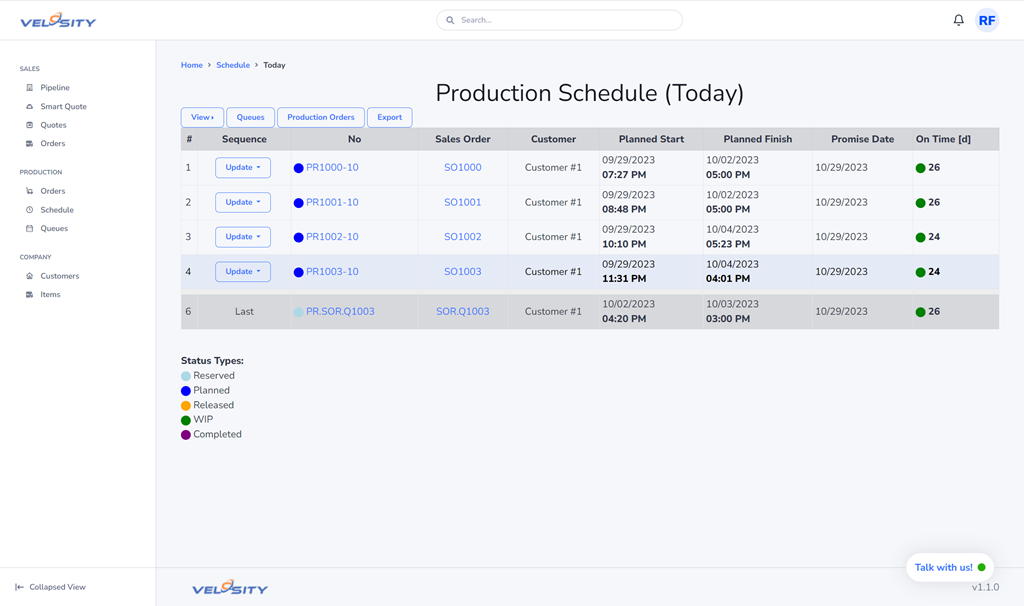 The production schedule can be viewed and managed within Velosity. From here, the sequence (priority) of a Production Order can be changed. Once changed, the production schedule is automatically recalculated.